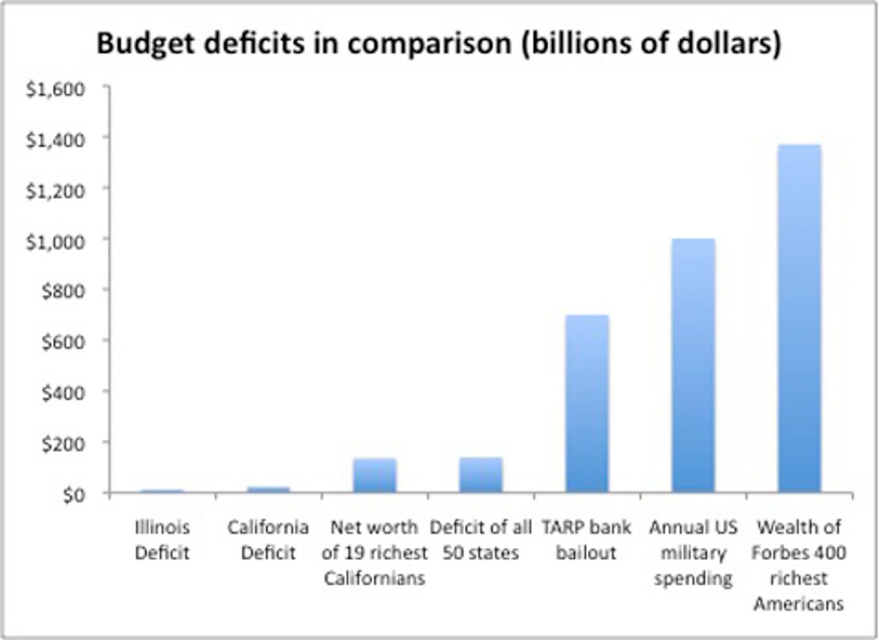 • Illinois The budget crisis in the state is one of the most severe in the country—about $13 billion, on top of $6 billion in unpaid bills to various agencies, and a pension fund that is underfunded by about $130 billion. In addition to severe cuts in social programs, some Democrats had proposed a sharp raise in the income tax—a regressive flat tax that presently stands at 3 percent—and the state corporate tax. However, this proposal appeared to fail on Friday.