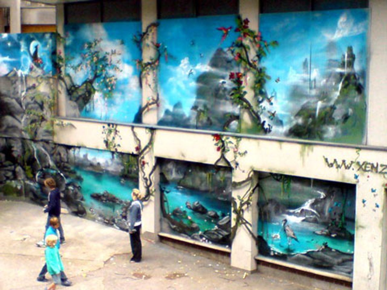 An oasis fantasy scene by Xenz caught my attention. Detailed ivory weeds climb the pillars of one 1960s building, opening onto a scene of blue waters and high mountains that are in stark contrast with the drab grey canvas provided. The work is well integrated into the crumbling structure. Yet because of the lack of coherent theming, its impact is somewhat undermined by bright green cartoon Frankenstein heads to its left.