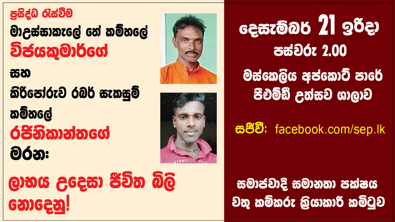 සමාජවාදී සමානතා පක්ෂය සහ වතු කම්කරු ක්රියාකාරී කමිටුව, “මාඋස්සාකැලේ විජයකුමාර්ගේ මරනය: ලාභය උදෙසා ජීවිත බිලි නොදෙනු!” යන මැයෙන් සංවිධානය කරන ප්රසිද්ධ රැස්වීම දෙසැම්බර් 21 වැනි දා මස්කෙලිය අප්කොට් පාරේ පීඑම්ඩී උත්සව ශාලාවේ දී දවල් 2ට ආරම්භ වෙනු ඇත.