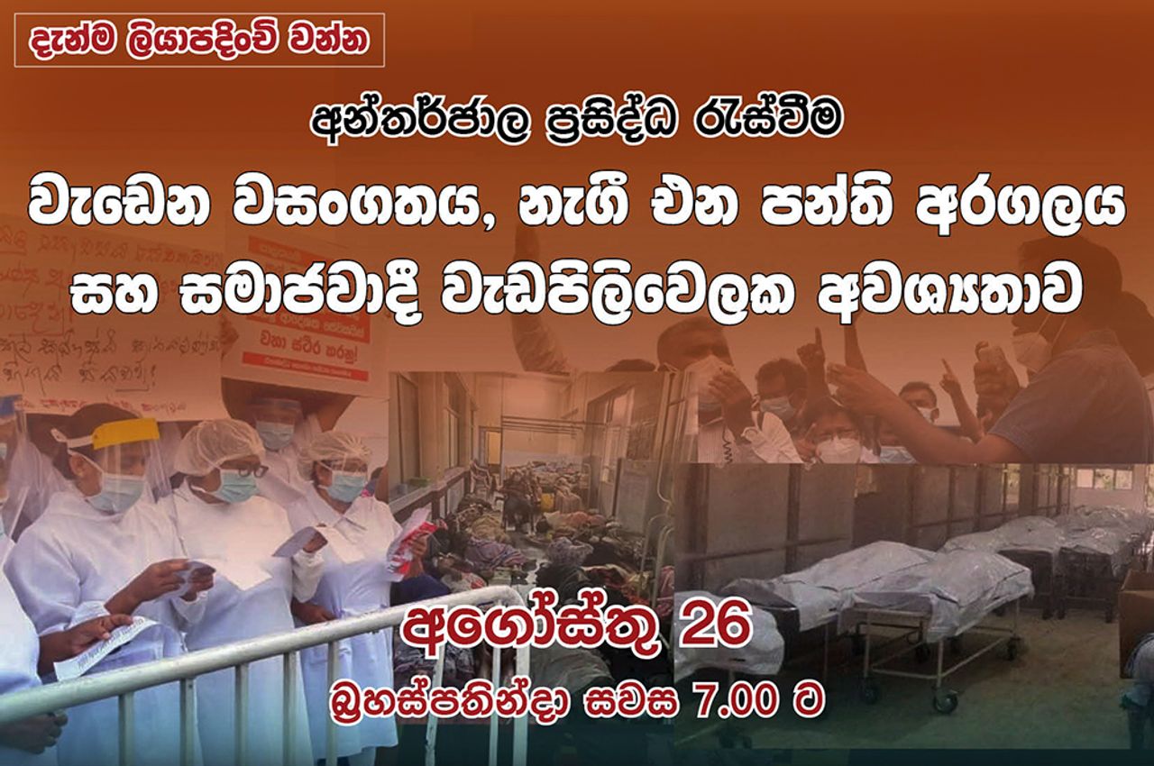 ආන්ඩුව ඒ සඳහා ප්රතිචාර දක්වා ඇත්තේ නැගී එන මහජන විරෝධය මැඩපැවැත්වීමට සහ මෙම අර්බුදයේ බර කම්කරුවන් හා ගම්බද දුගීන් මත පැටවීම සඳහා ඒකාධිපති පාලන ක්රම සඳහා වූ සිය සූදානම තීව්ර කිරීමෙනි. වසංගතය හේතුවෙන් ඇති වන විනාශයට එරෙහිව සටන් කිරීමට සහ ඔවුන්ගේ අරගල ඉදිරියට ගෙන යාමට වැඩ කරන ජනතාවට අවශ්ය සමාජවාදී වැඩපිලිවෙල ගැන සසප රැස්වීමේදී සාකච්ඡා කරනු ඇත. මෙම රැස්වීමට සහභාගී වන ලෙසත් මෙම අරගලය සඳහා සසප සමඟ එකතු වන ලෙසත් අපි කම්කරුවන්ගෙන්, තරුනයන්ගෙන් හා අනෙකුත් ලෝසවෙඅ පාඨකයින්ගෙන් ඉල්ලා සිටිමු.