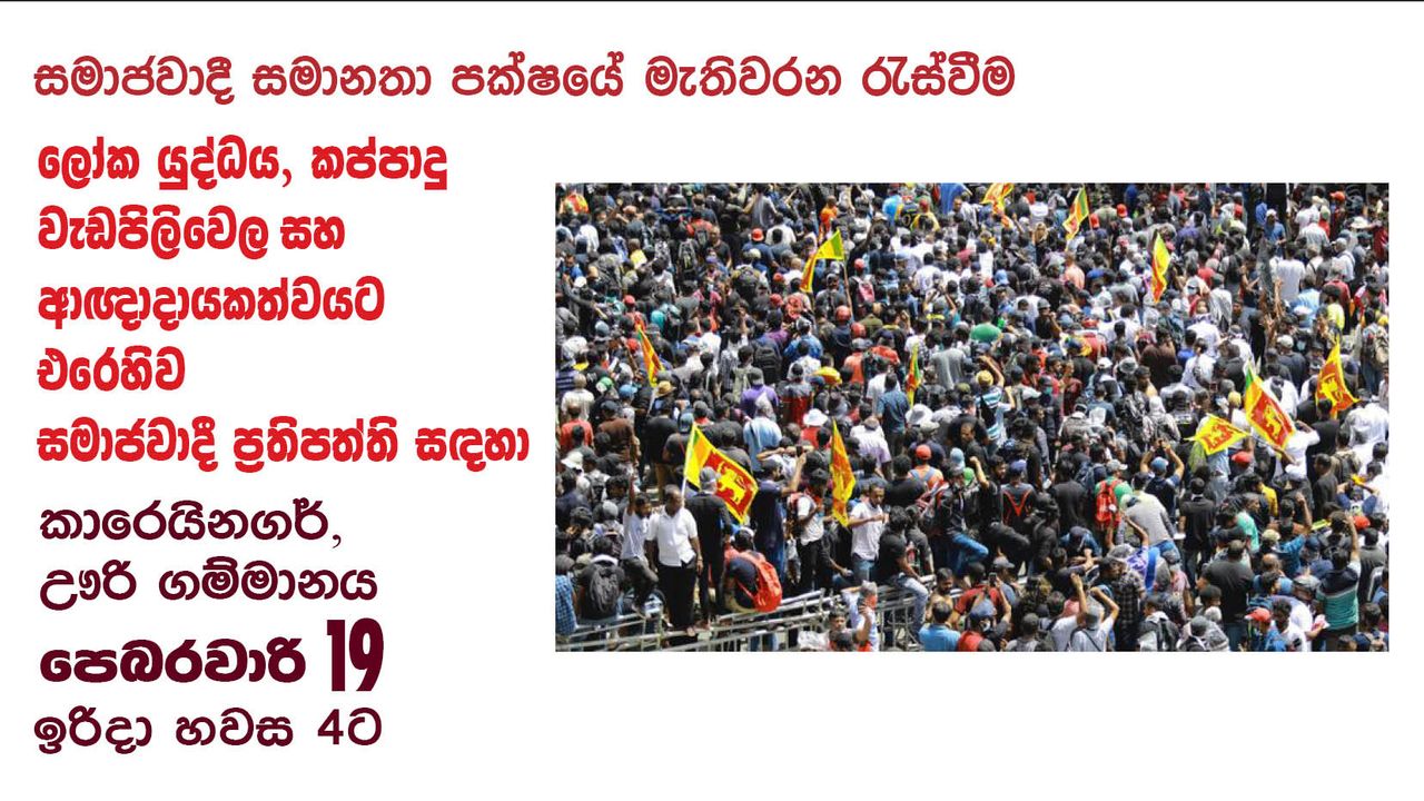 අපි, ලෝක යුද්ධයේ තර්ජනයට එරෙහි සටන අපගේ උද්ඝෝෂනයේ කේන්ද්රීය අක්ෂය බවට පත්කරගෙන සිටිමු. ශ්රී ලංකාව මුහුන දී සිටින දැවැන්ත ආර්ථික හා දේශපාලන අර්බුදය, අන් රටවල මෙන්ම, කොවිඩ්-19 වසංගතයෙන් සහ යුක්රේනය තුල රුසියාවට එරෙහි එක්සත් ජනපද-නැටෝ යුද්ධයෙන් බෙහෙවින් තීව්ර කරන ලද ධනවාදයේ ගෝලීය අර්බුදයේ කොටසකි. වික්රමසිංහ ආන්ඩුව මෙම අර්බුදයේ බර වැඩකරන ජනතාව සහ ගම්බද දුගීන් මත පැටවීම සඳහා දැඩි කප්පාදු පිලිවෙත් ක්රියාවට දමමින් සිටී.