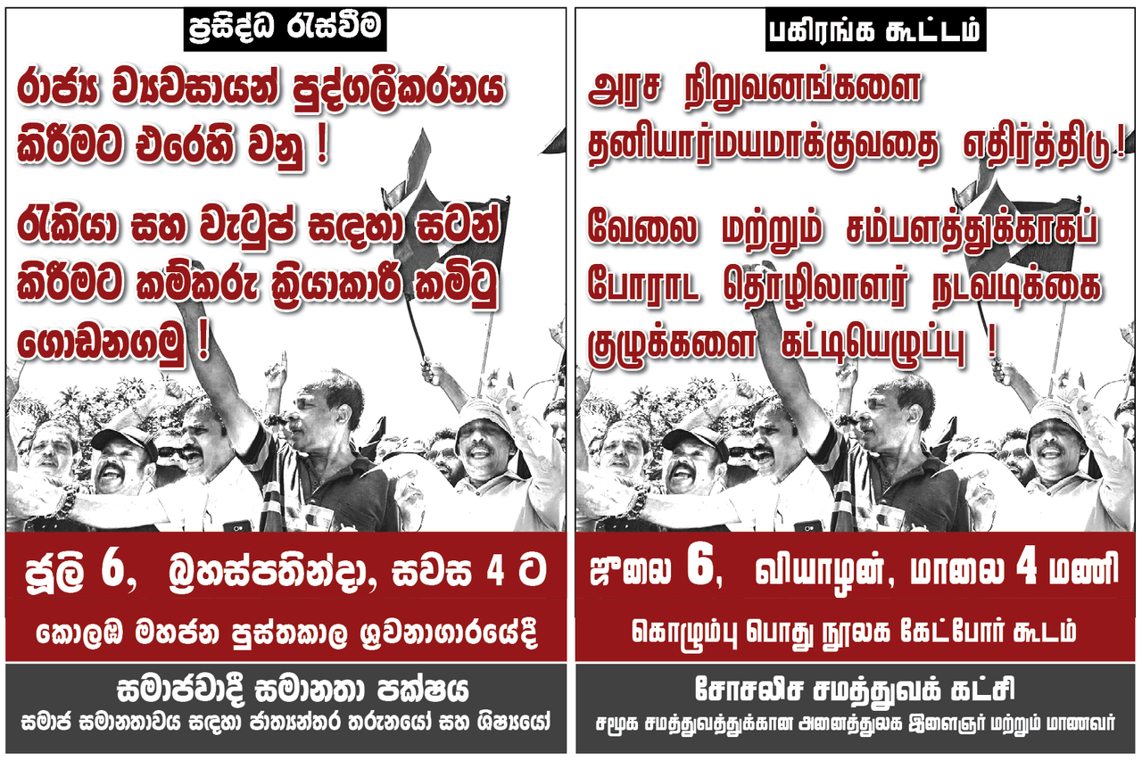 සමාජවාදී සමානතා පක්ෂය (සසප) සහ සමාජ සමානතාව සඳහා ජාත්යන්තර තරුනයෝ හා ශිෂ්යයෝ (සසජාතශි) විසින් ජූලි 6දා සවස 4ට කොලඹ මහජන පුස්තකාල ශ්රවනාගාරයේදී පවත්වන ප්රසිද්ධ රැස්වීමට සහභාගී වන ලෙස සිතන මතන කම්කරුවන්, තරුනයින්, ශිෂ්යයින් සහ බුද්ධිමතුන් ඇතුලු අවශේෂ ජනයාගෙන් අපි ඉල්ලා සිටිමු.