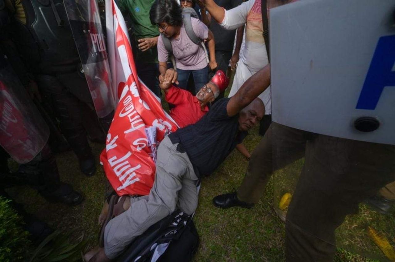 පොලිසියේ බලහත්කාරී විසුරුවා හැරීම මැද ජයසූරිය, සහ එම පක්ෂයේ තවත් නායකයකු වන ශ්රීනාත් පෙරේරා සහ සමාජ ක්රියාකාරිකයෙකු වන සන්ධ්යා එක්නැලිගොඩ (රජය විසින් අතුරුදහන් කරනු ලැබූ මාධ්යවේදියෙකු වන ප්රගීත් එක්නැලිගොඩගේ බිරිඳ) බිම ඇද වැටුනෝ ය. තල්ලු කිරීම්වලට ප්රතිරෝධය පාමින් සිටි මාධ්යවේදියෙකු වන තරිඳු උඩුවරගෙදරගේ කමිසයෙන් ඇඳ ගත් පොලිස් නිලධාරියා “පොලීසියත් එක්ක ඕවා දාන්න එන්න එපා” යැයි ඔහුට තර්ජනය කලේ ය.