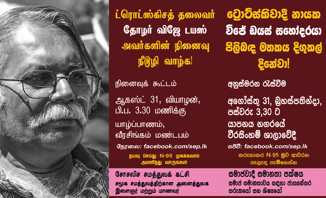 ශ්‍රී ලංකාවේ සමාජවාදී සමානතා පක්ෂය (සසප) සහ සමාජ සමානතාව සඳහා ජාත්‍යන්තර තරුනයෝ සහ ශිෂ්‍යයෝ (සසජාතශි), සසප හිටපු ප්‍රධාන ලේකම් විජේ ඩයස් සැමරීම සඳහා යාපනයේ රැස්වීමක් පවත්වනු ඇත. එය, අගෝස්තු 31 බ්‍රහස්පතින්දා, පස්වරු 3.30 ට යාපනය නගරයේ වීරසිංහම් ශාලාවේදී පැවැත්වේ.