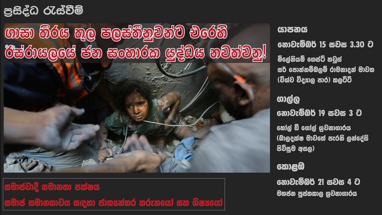 - සසජාතශි කොලඹ පවත්වන ප්රසිද්ධ යුද විරෝධී රැස්වීමට සහභාගී වන්න! ගාසාවේ පලස්තීනුවන්ට එරෙහි ව සිදු කෙරෙන ඊශ්රායල් ජනසංහාරක යුද්ධය නතර කරනු!
