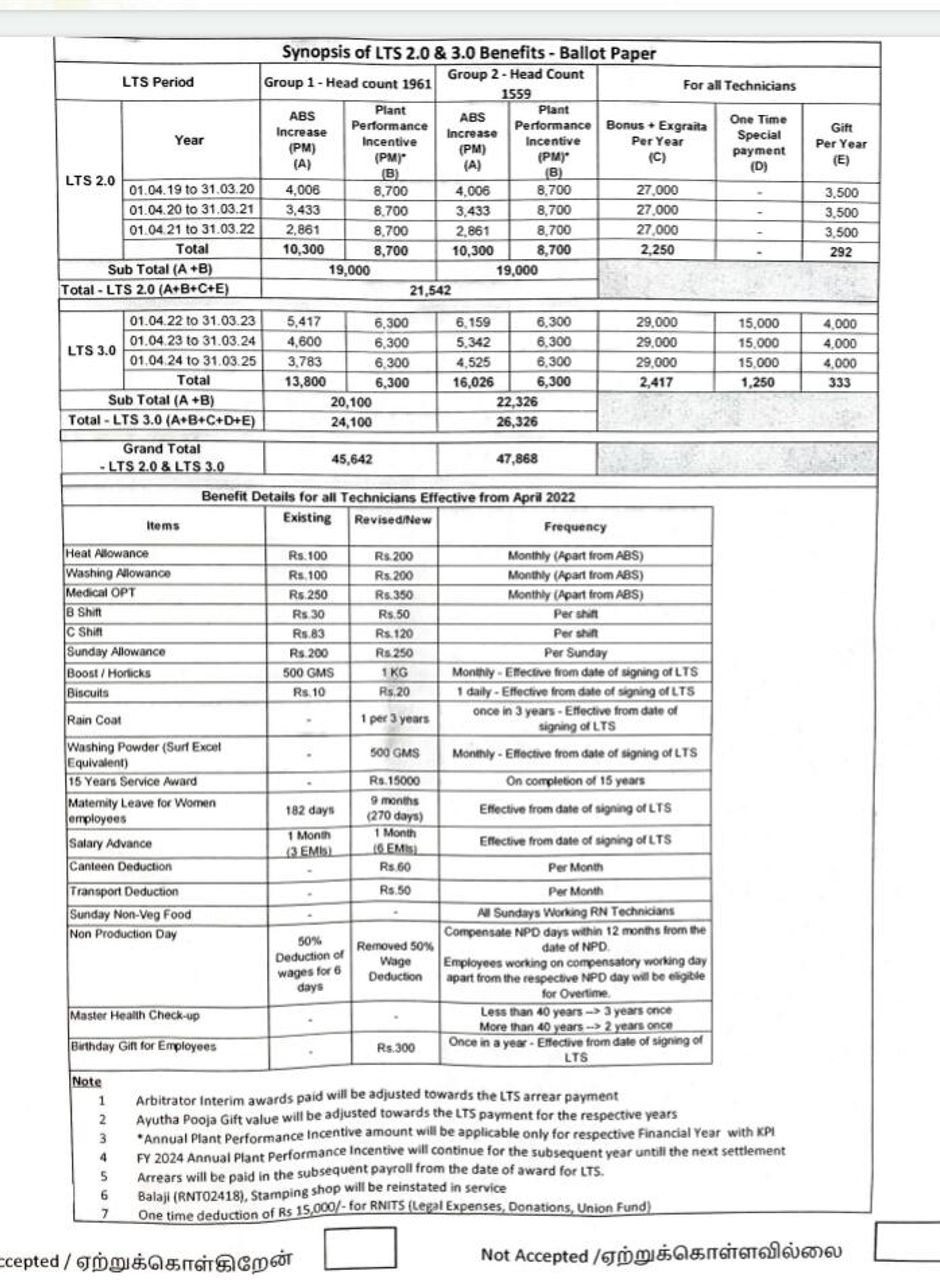 தொழிலாளர்கள் அடுத்தடுத்த இரண்டு ஒப்பந்தங்களுக்கு வாக்களிக்கிறார்கள் என்று தொழிற்சங்கம் கூறிக்கொண்டாலும், அவை ஒன்று தான் என்பது போல அவற்றின் மீது ஒன்றாக ஒரே நேரத்தில் வாக்களிக்கும்படி கேட்டுக் கொள்ளப்பட்டனர்.